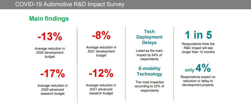 近日,IHS Markit对北美、欧洲和亚洲共140家汽车制造商和零部件供应商(其中30%OEM70%为供应商)展开了一项调查,以评估疫情对公司研发的影响。调查结果显示,今年全球汽车行业的平均研发预算将削减13%,其中在先进技术上的研究投入将削减17%2021年,全球汽车行业的平均研发预算将减少8%,其中在先进技术上的研究投入将减少12%