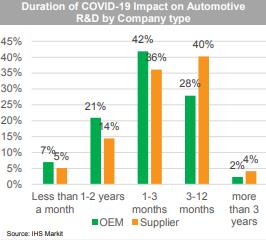 亚洲(特别是中国)的企业表示,疫情将对汽车业研发投入有着长期的影响(超过3年);而大多数北美的企业则表示影响在三个月内即会消失。OEM的态度更为乐观,较高比例的OEM认为疫情对研发投入的影响只有三个月或者更少。