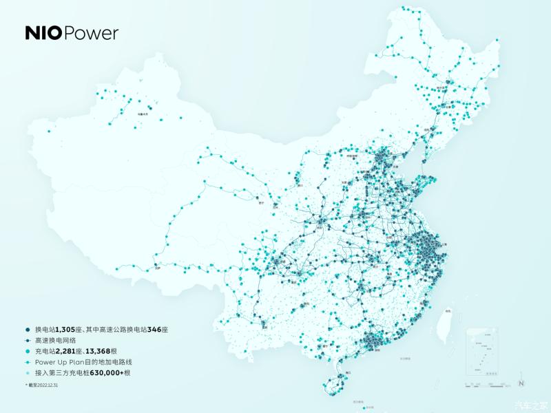 蔚来第二代换电站可实现车辆自动泊入,用户无需下车,即可在车内一键启动自助换电,换电过程仅需3分钟。截至1231日,68.81%的蔚来用户的住所或办公地点,距离蔚来换电站在3公里以内。目前,蔚来在中国市场已累计建成换电站1305座(其中高速公路换电站346座)、充电站2281座(充电桩13368根),接入第三方充电桩超63万根。此外,据官方表示,2023年,蔚来在中国市场将累计建成换电站超1700座,充电桩超20000根。NIO Power “可充可换可升级”的能源服务体系,为用户提供全场景的加电服务,努力实现“让加电比加油更方便”的愿景。