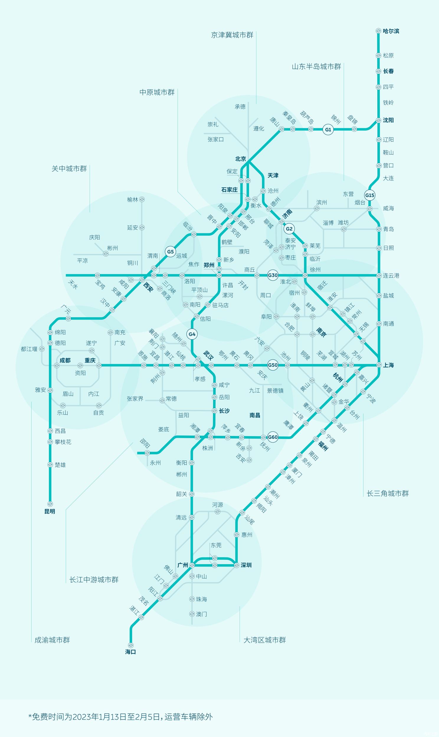 5纵:G1京哈高速、G2京沪高速、G4京港澳高速、G5京昆高速、G15沈海高速;