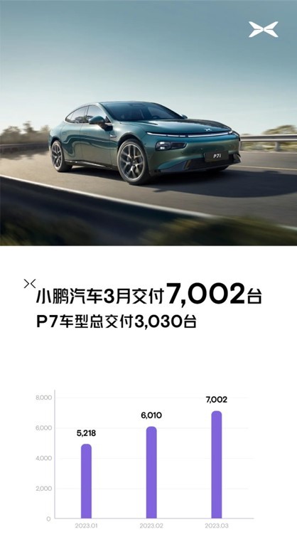 记者日前从官方获悉,小鹏汽车发布了3月交付量。数据显示,2023年3月小鹏汽车交付7002辆,环比增长17%。随着P7i车型的上市和交付开启,3月P7车型总交付3030辆,环比增长32%。