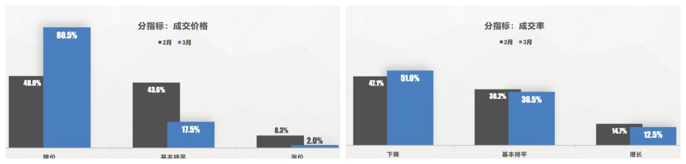 这一点在3月份成交率和成交价格指数方面有所体现。有51%的经销商认为3月份成交率下降,36.5%的经销商认为持平,只有12.5%的经销商认为成交率增长。