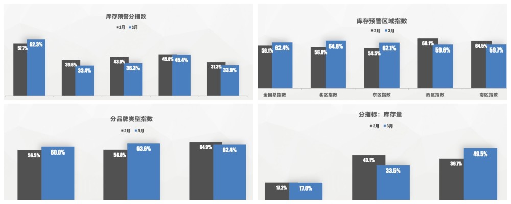 3月库存预警指数为62.3%,同比下降1.2个百分,环比上升4.3个百分点,库存预警指数位于荣枯线之上。市场需求、平均日销量、从业人员、经营状况指数环比下降。其中,平均日销量数据下降最为明显,降幅为6.7%。
