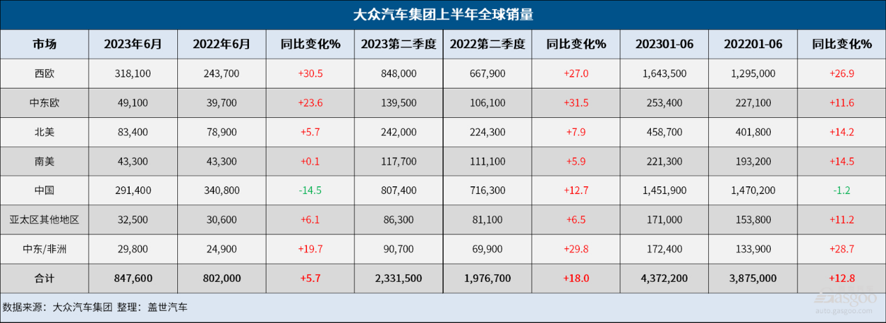 从市场来看,今年上半年,除了中国市场外,大众汽车集团在全球其他市场的销量均实现了增长。