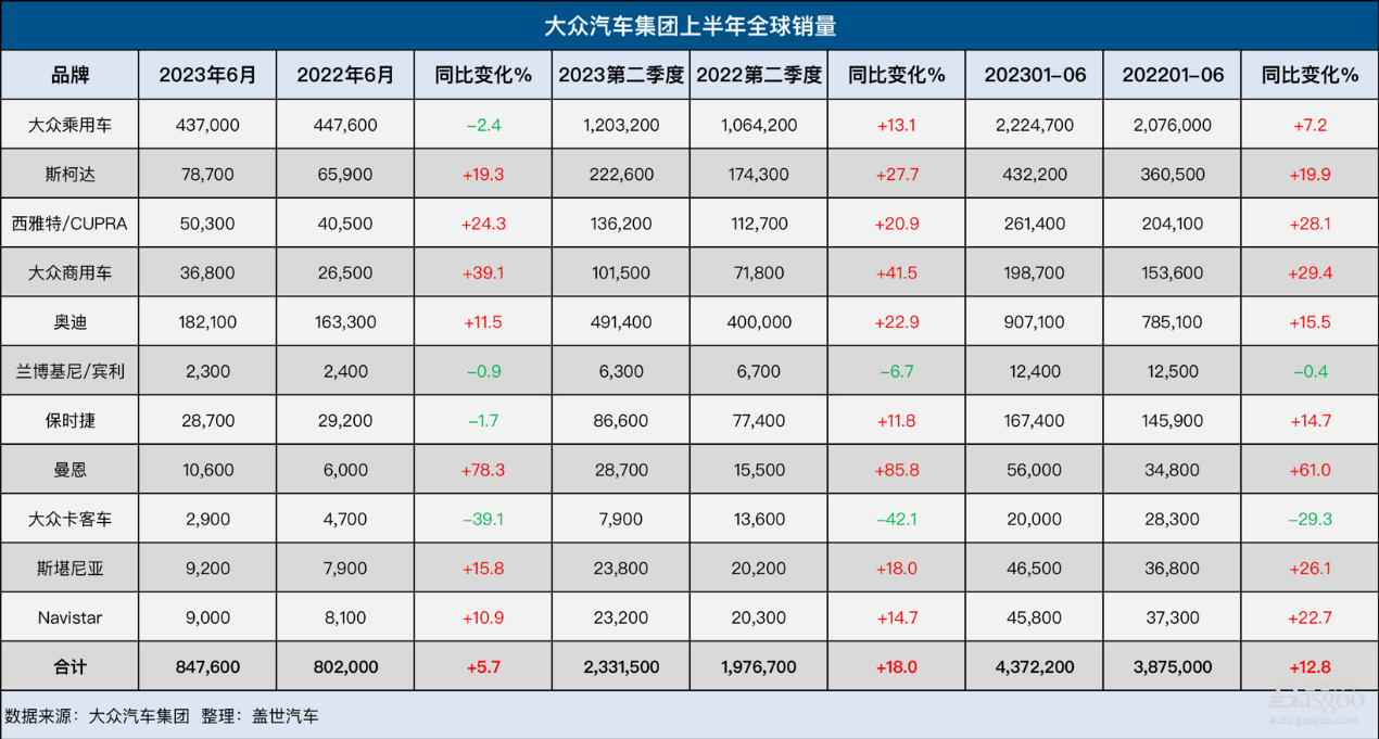 到了2023年上半年,受益于供应状况进一步改善等因素的影响,大众汽车集团在全球范围内的交付量同比增长12.8%,达到437.22万辆。总体来看,大众汽车集团今年上半年的销量表现优于去年,旗下绝大部分品牌的销量也呈增长的趋势。