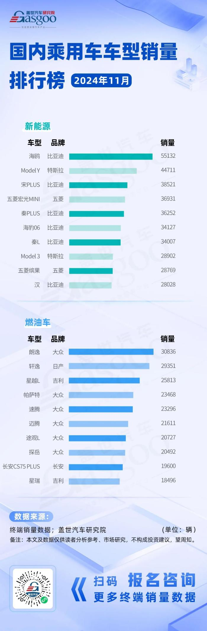 比亚迪、大众持续领先市场 | 2024年11月国内乘用车车型销量排行榜
