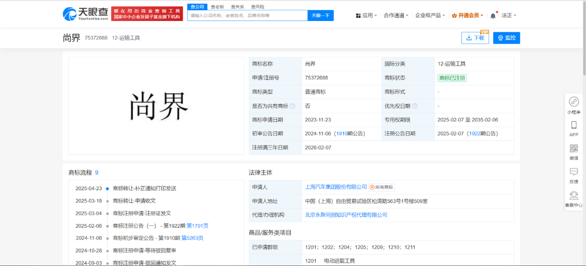 5月28日,据天眼查显示,华为技术有限公司于近日将一枚“尚界”商标转让给上汽集团,该商标申请于2023年11月,国际分类为运输工具,当前该商标已成功注册。
