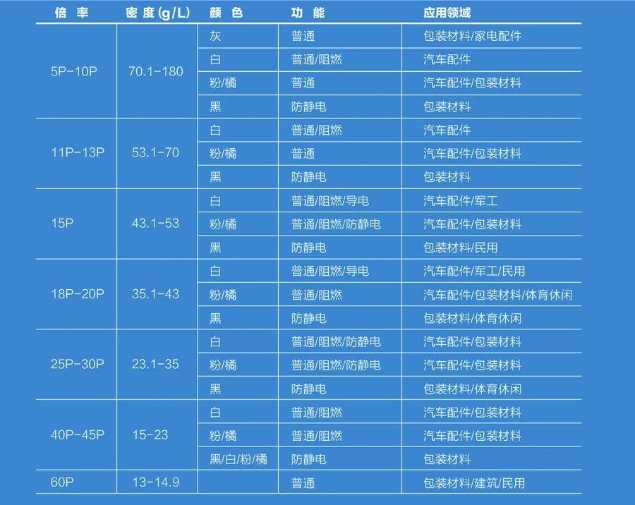 The main color of foamed polypropylene produced by our company are black, white, orange, grey and so on. The foaming rate is 5-60 times, and the foaming density range is 13g/ l-180 g/l.